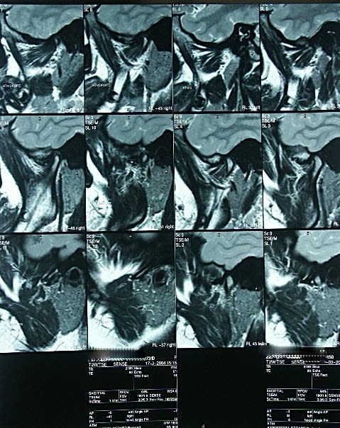 Sur le 5ème et 8ème cliché,je devine une postériorisation du condyle,donnant une compression de la zône bilaminaire,qui a l'habitude de générer beaucoup de symptômes.