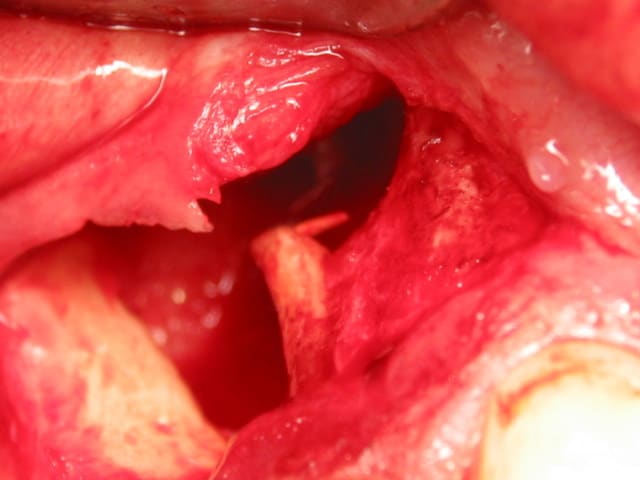 Alors ensuite ca se discute, j ai mis du bioos + tratracycline + membrane. Les endo n'aiment pas le bioos et preferent laisser le perioste jouer le role de membrane naturelle. Manque de bol ici, la partie vestibulaire de la corticale a explosee en petits éclats tres fins et une grosse fibrose a épaissie la muqueuse gingivale. j'ai du tous dissequer pour que ca soit propre.