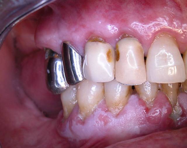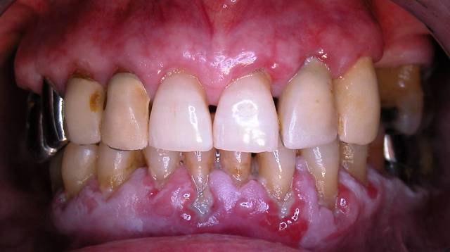 Le problème, n'est pas la parodontite, mais des lésions blanches, situées surtout à la mandibule. La patiente ne fume pas et ces lésions ne partent pas au grattage.