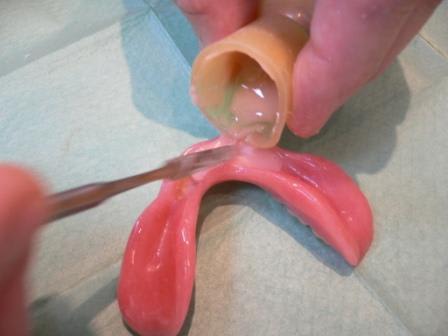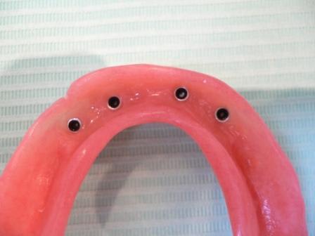 rebasage de la prothèse totale provisoire sur des cylindres provisoires en titane connectés aux piliers défintifs avec suppression des extensions.