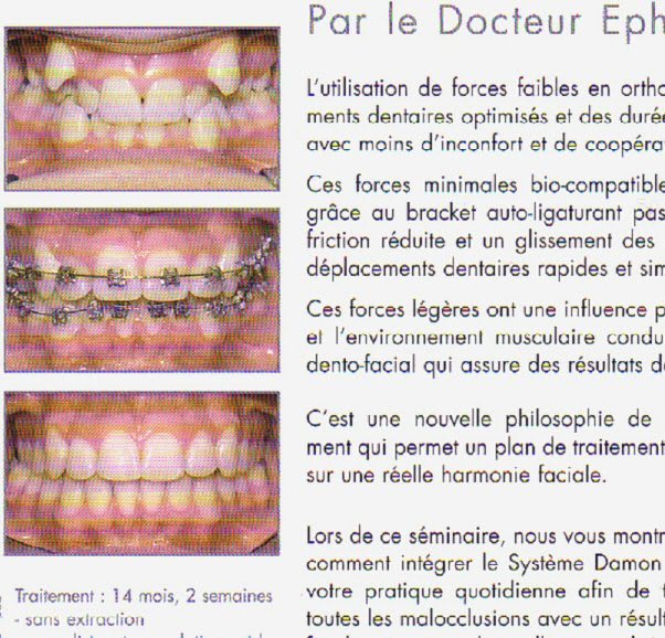 la recherche du moindre frottement, la diminution des réactions secondaires ou plutôt parasites qu'occasionnent les techniques ligaturantes, une autre vision de mes plans de traitement grâce à "l'outil autoligaturant" dont notament la diminution des cas avec extractions.