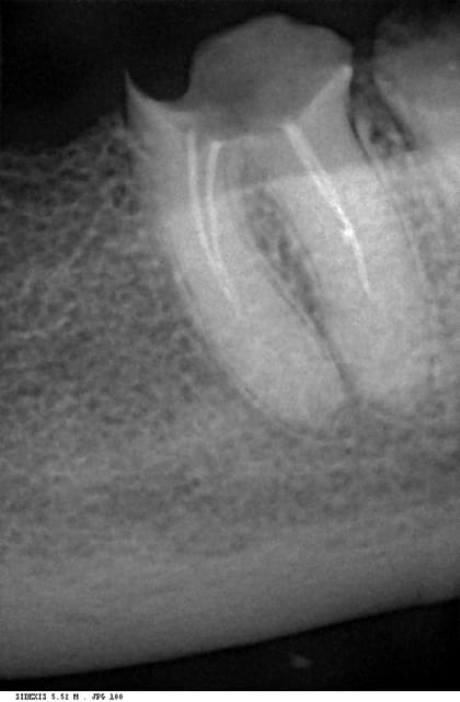 Maintenant, ici, avec un plancher aussi bas par rapport à l'os et aussi proche de la furcation, une fois les tissus cariés "excavés" et l'élongation coronaire réalisée, on sera devant une situation un peu (beaucoup) scabreuse, non ?