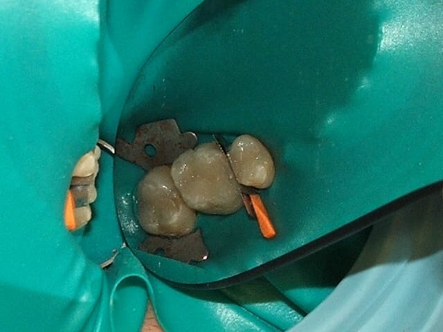 Concernant la pose de la digue et les reconstitution s composite cf :Pratique clinique en dentisterie restauratrice ed quintessence internationale 2003,notamment le chapitre "gestion de l'humidité en DC à l'aide de la digue",mais aussi celui sur la mise en place des restaurations composites avec iconographie de grande qualité sur prepa+digue+matrice+coin interdentaire etc...
