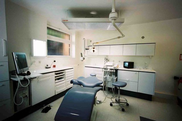 L'unit à gauche derrière, très américain, se conçoit difficilement sans une assistante en permanence au fauteuil, qui donne les instruments dynamiques au dentiste et les reprenne pour les reposer sur leur carquois (à moins que l'on soit gaucher, mais c'est difficile de l'imaginer comme ça).