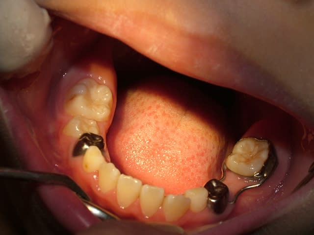 - couronnes pedo(54-64-65-75) sur dts vivantes: trop délabrées pr pouvoir reconstituer correctement en retrouvant une DV correcte mais de la dentine réactionnelle,pas d'infection