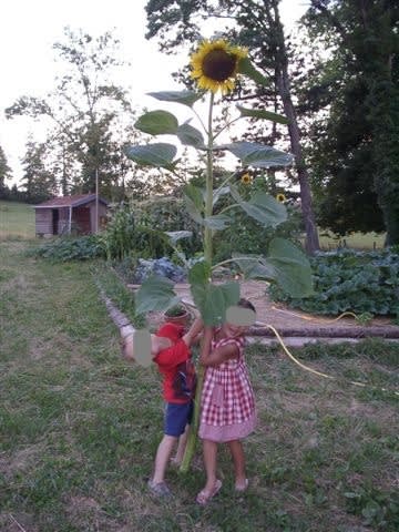 Des soleils géants (tournessol)orientés est et vers chez toi, le long d'un mur, chaque matin c'est le bonjour au jardin.