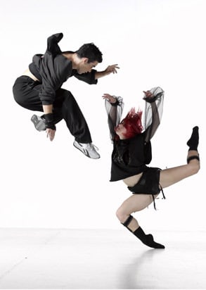 Virtuoses aériens shootés en plein vol par une photographe au cadrage instinctif génial projetant en temps réel sur deux téléprojecteurs géants et mobiles les poses accrobatiques d'une troupe jeune, athlétique, sexy, à la plastique dynamique, aux costumes noirs et empruntant largement à la lingerie, mi nus , mi trash.