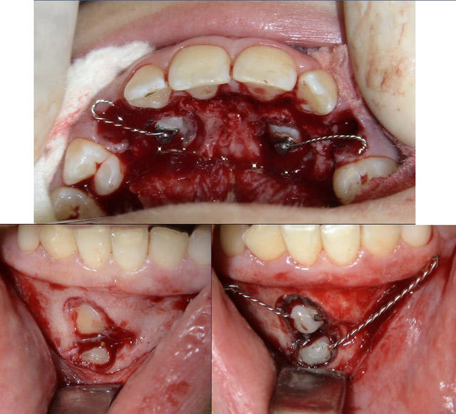 Un système que je développe moi-même depuis quelques années et qui a des possibilités d’évolution qui semblent infinies (Rev Orthop Dento Faciale 2006;40:63-90). Ici, j’ai utilisé deux vis de chirurgie maxillo-faciale en tandem sous muqueuses. Y est accroché un fil en TMA .018 qui émerge en latéral le long du vestibule et vient tracter, comme une « canne à pêche » la ligature qui est collée directement aux couronnes des canines incluses.
