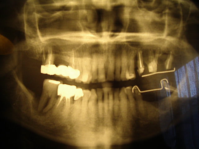 Suite prévue: protheses fixes...... reste le probléme de la 27 sur laquelle y'a encore du boulot (ai déposé bridge ce matin, dscellé le mauvais screw post palatin et laissé de l'essence de girofle pour ramollir pate dedans les racines...).