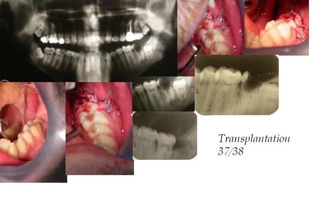 Nous avons décidé de réaliser cette transplantation dans un but avant tout pédagogique. Elle présentait environ toutes les contres indications : patient peu (pour ne pas dire "pas") motivé, contrôle de plaque presque inexistant (il n'y a qu'à voir l'état de la 37), la 38 avait largement finie son édification apicale. De plus il fallait voir la tête du patient quand je lui ai dit de ne pas fumer de la journée (même du tabac)!!
