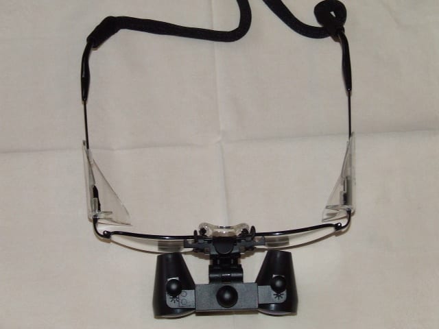 J'utilise des loupes Heine 2.3 x sur un bandeau.La distance de travail est de 34 cm.