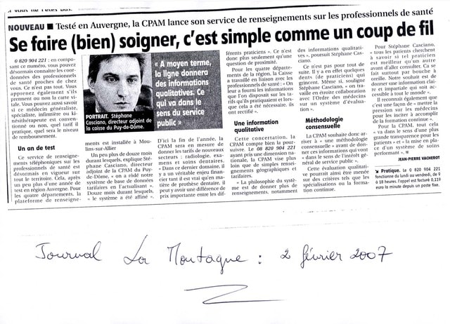 Je vous livre en pature, le document joint paru dans la presse Auvergnate ce-matin même. C'est tout frais. En ce qui me concerne je commence par faire valoir mes droits auprès de la CNIL (loi de 1978)pour obtenir les infos me concernant contenues dans cette base. Il faudra, entre autres, m'expliquer ce que sont ces "informations qualitatives" et aussi avec quel instrument on mesure si "tel praticien est meilleur qu'un autre"(sic).