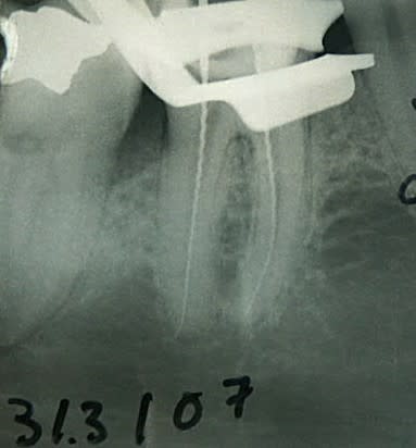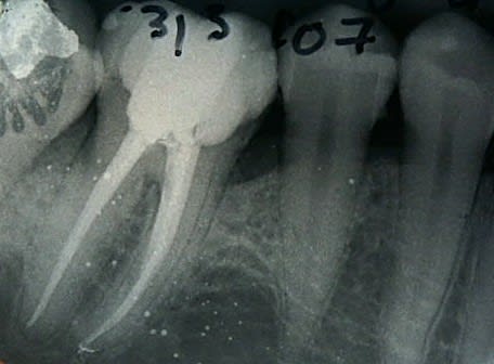 ci-joint urgence de 14h, réalisée selon cette technique en 1/4 d'heure. Certe petit dépassement de AH+, le RayPex bipait à une petite distance de l'apex radio, mais le rinçage à l'hypo + US a permis de bien nettoyer les deux orifices apicaux objectivés par la percolation de l'AH+.