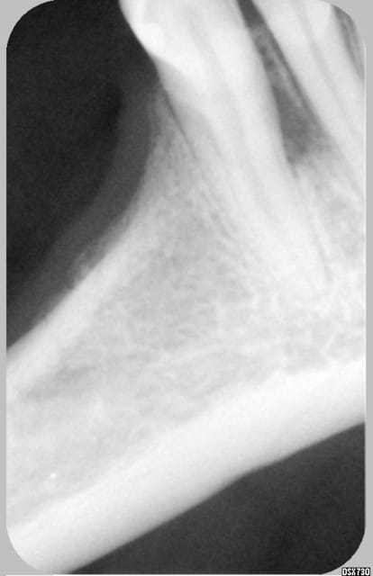 L'image montre une raréfaction osseuse entre 33 et 32.