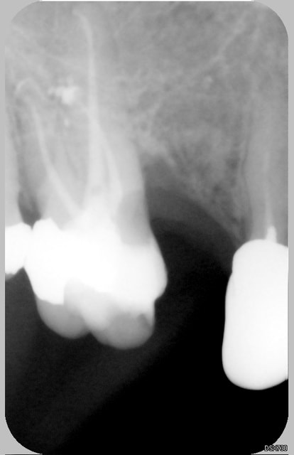 cf une radio par exemple 10-2006 parmi tant d'autre. Dent traitée pour une pulpite en 2005 sans cause flagrante. Radio prise pour faire une reconstitution prothétique. Lyse radiculaire M sous-gingivale. Palpation à la sonde : paroi dure et lisse