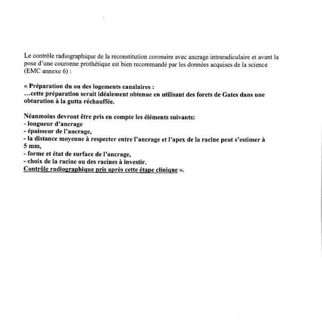 Parmi les griefs que je trouve abusifs, mais référencées par la CDC à partir des recommandations de l'andem, c'est la longueur des tenons. Selon l'andem, un tenon doit arriver à 5 mm de l'apex. Mes tenons je les mets à la mi-racine alors elle les trouve trop court.