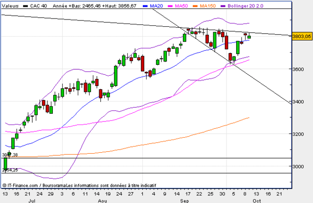 le courant acheteur est particulierement fort jusqu'à maintenant. Cà va peut être hésiter sur les 3800 pts et faire ensuite une belle extension sur les 4000-4100 pts pour le mi-octobre?