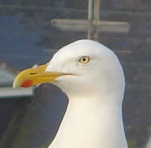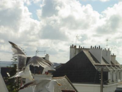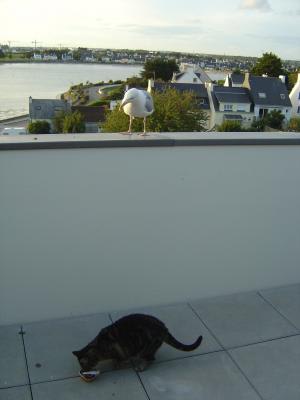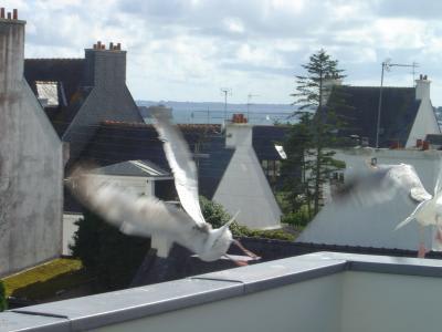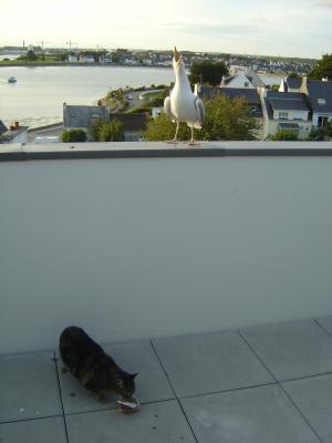 hôtes permanents. lui, c'est le caïd du quartier, il poursuit tous les "intrus" sur son aire et il fait bien son boulot, c'est pour ça que la femelle est en admiration devant ses prouesses aériennes (loopings, piqués, passage à fond en rase-motte;). tous les matins et tous les soirs, ils viennent dire salut et passent leur journée en mer ou dans des décharges d'ordures (ils ont parfois de la sauce tomate sur leur plumage). c'est des pirates, mais ils sont supersympa. de temps en temps, ils font la sieste à 2 mêtres de nous et dorment vraiment, ils n'ont peur de rien.