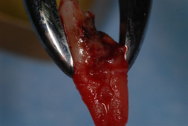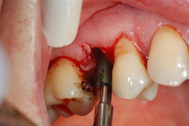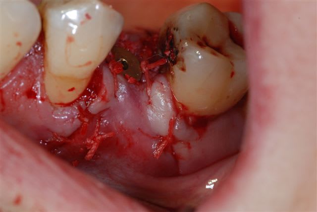 suite de la prémolaire fracturée: extraction , mise en place d'un implant tekka diametre 4 longueur 15 mm pour aller chercher un bon ancrage primaire. Il y avait 2 mm d'espaceentre l'implant et la corticale en vestibulaire et 1 mm en palatin, j'ai comblé au bio-oss et tracté la muqueuse sans tensions pour le recouvrir.