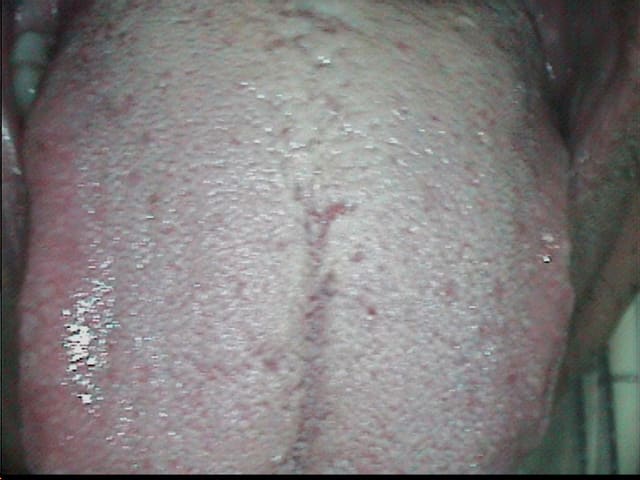 L'examen biologique révele l'existence du candidas albicans déja à l'examen direct et l'examen exobuccal montre des dépots blanchatres au niveau des joues avec une forme de microabcés entrant dans le cadre d'un syndrome dont j'ai oublié le nom. la langue est de couleur blanchatre tout le temps et montre des papilles plus longues que d'habitude.