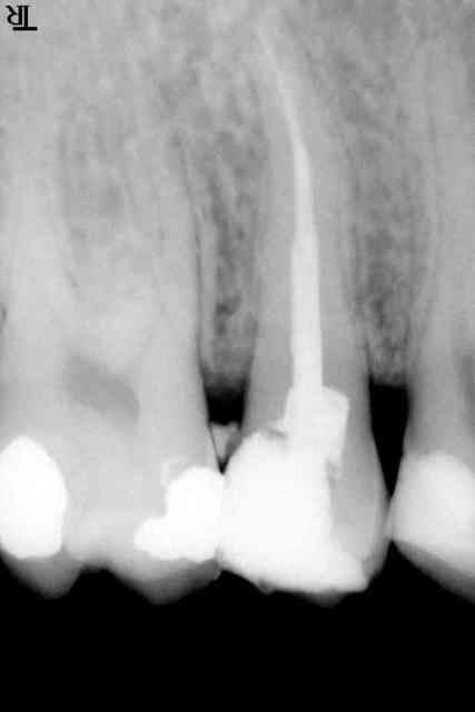 Je fais sauter le compo; c'est sensible. Intra ligamentaire c'est encore sensible. Je me dis pulpite chronique ... temporiser. Je dépose complètement le compo. Je curete à minima délicatement et je place dans la cavité un eugénate.