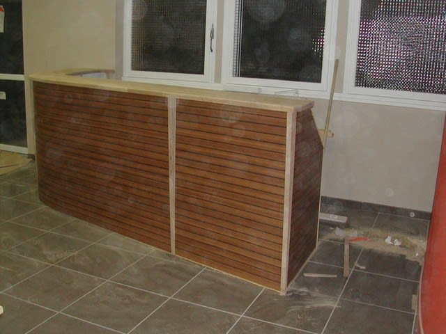 l'electricien pose une goulotte de prise sous le plan de travail de la borne d'acceuil, je part faire une course, et en revenant, je le retrouve perplexe devant la borne d'acceuil: