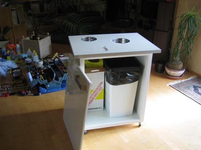 Une ouverture de 153 donnant sur la poubelle généraliste (grand sac poubelle 110 litres dans un panier à linge plastique à parois latérales ajourées pour ne pas accumuler d'air entre le sac et le panier)