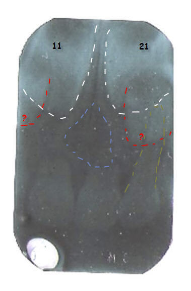 Au dessous des germes de 11 et 21 ce sont peut-être des germes de dents surnuméraires (en rouge), ils semblent symétriques; il faudrait voir sur la pano où sont 12 et 22: Mais je ne vois ni 62 bis ni 22 bis.