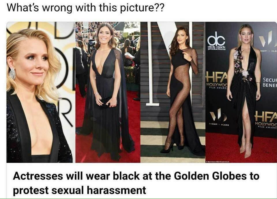 Le problème c'est qu'aucuns acteurs ne les aient suivis dans cette dénonciation du harcèlement sexuel en venant en micro short en résille, veste de cow boy en cuir noir sur moumoute apparente et chaîne en or qui brillent et casquette en cuir noir.