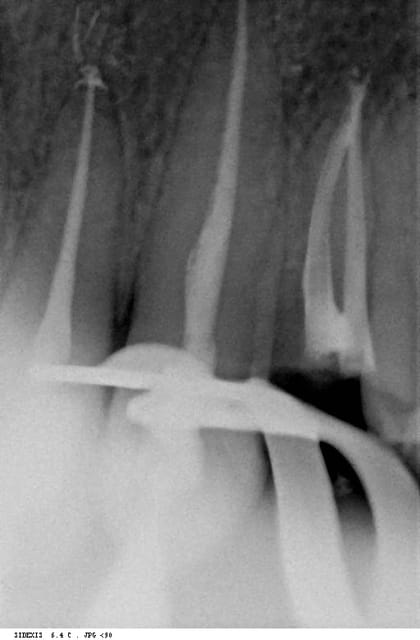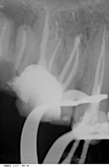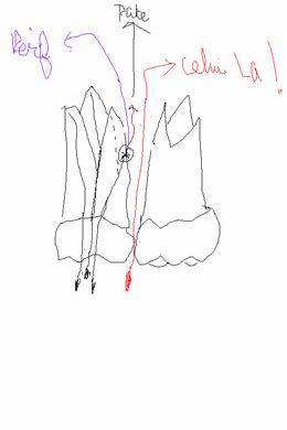 je regarde à nouveau cette radio,on voit la perf en distal,qui a suivi un chemin rectiligne plutot que de suivre la courbe de la dent,mais pourquoi cette autre broche entre les deux molaires?,ce n'est pas un canal,si je lis bien cette radio?