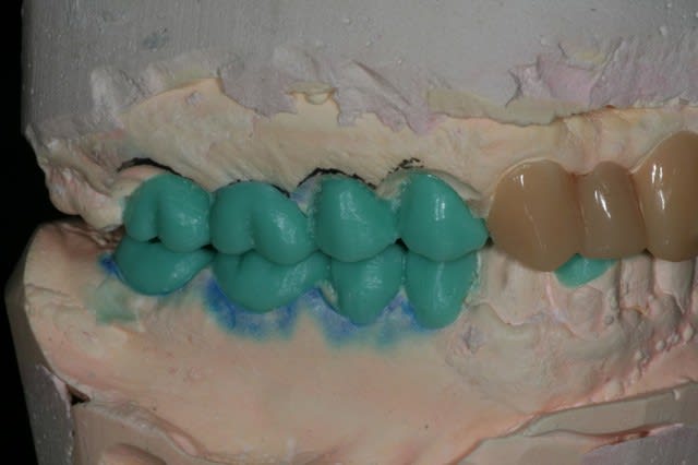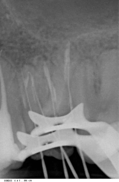 Si tu es dans le doute, et j'ai vu que les wax up concernait cette region, je t'avoue que je ne serais pas choque d'envisager l'hemisection de la racine pour eviter toute merde et de solidariser si le parodonte le permet les 3 dents.