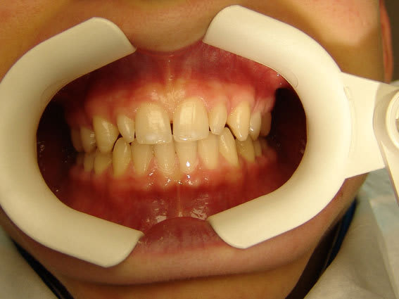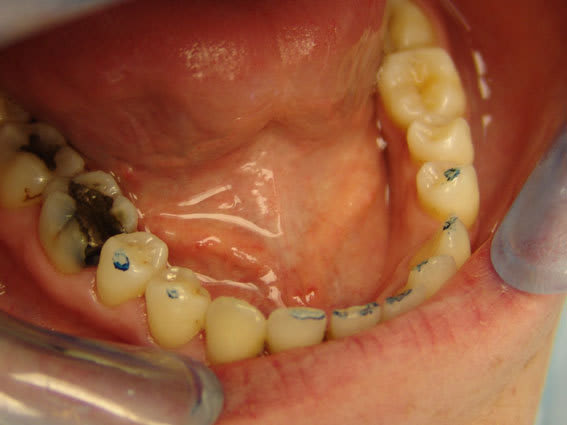 Patient de 16 ans, belles dents au sens où on l'entend habituellement, classe presque 1 (supraclusion incisive et déviation du point interincisif inférieur à gauche), les parents et le patient ne sont certainement pas demandeurs d'un traitement ortho. Pas de caries, une petite obturation occlusale en 26.