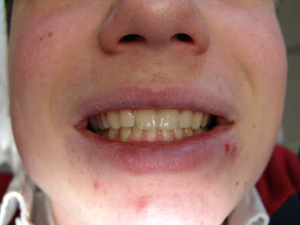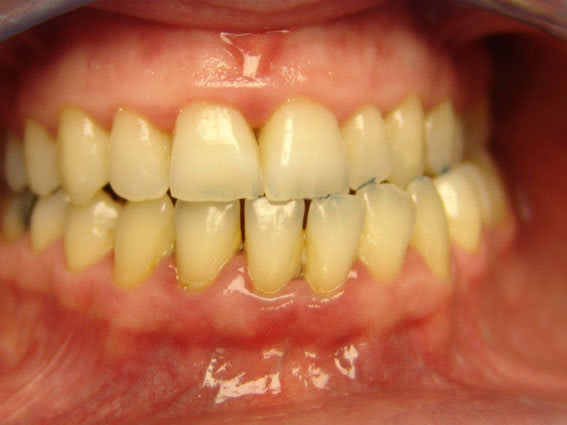 Ce n'est pas le meilleur cas du point de vue didactique: pas du fait de la patiente qui est réaliste, consciente de son état et à même d'évaluer objectivement ce qui se passe, mais parce qu'on se retrouve avec une béance importante et surtout un articulé croisé. cfr. photo.