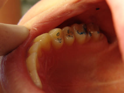 Il serait intéressant de noter le ph salivaire du matin, pris vers le fond de la bouche (avant brossage et petit déj) chez ces patients qui présentent des fossettes sur les cuspides des 36, 46. Je l'ai essayé sur 6 et ils sont curieusement et paradoxalement tous les 6 largement au-dessus de 8, nettement basique. Peut-être une coïncidence.