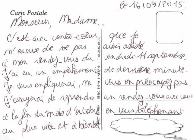 Patiente avec un ...2e rendez vous manqué, la semaine dernière :