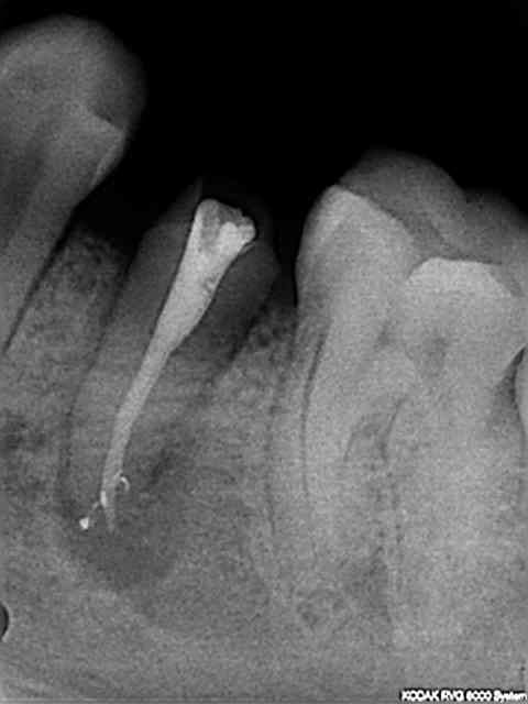 Obturation thermomécanique à 35/100 avec le ciment EZ-Fill (epoxy) remarquez les canaux latéraux et la densité de l'obturation.