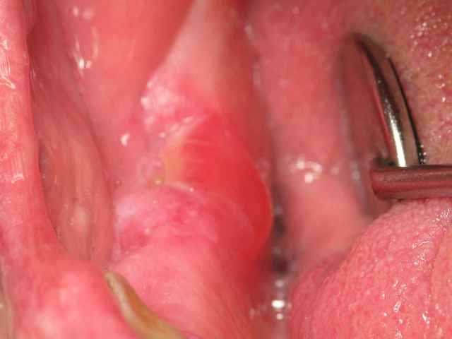 Apres enquête il s'avère que le patient a des antécédents de carninome épidermoide invasif au niveau des lèvres inférieures et de la gorge, ce dernier a commencé un traitement en 2002 mais a refusé de le terminer et n'a jamais procédé à de nouveaux conrôles. Entre temps il a changé de médecin et de dentiste et a soigneusement pris soins de ne rien dire.