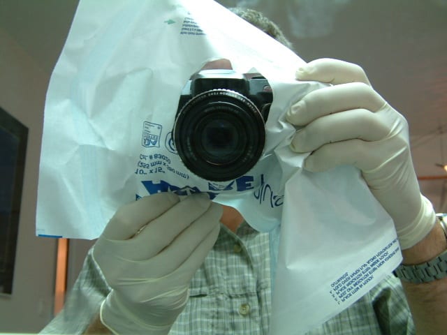 pour la stérilité je troue le côté papier d'une gaine pour laisser passer l'objectif puis je stérilise cette gaine à l'autoclave. ci joint un cliché du dispositif.