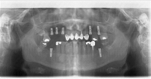 Bien sûr pas de passeport implantaire, pas de wax up, mi même de guide...encore les que là ils ont pas l'air d'être trop mal posé...en pinaillant on pourrait dire trop étroits pour les secteurs molaires...mais bon avec une pano on peut pas se rendre compte du volume osseux dispo...