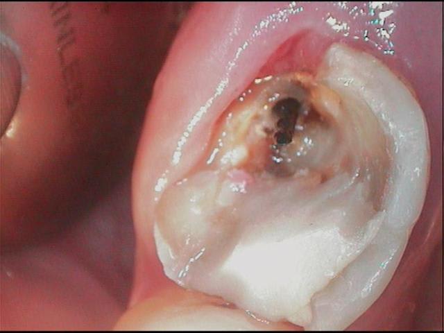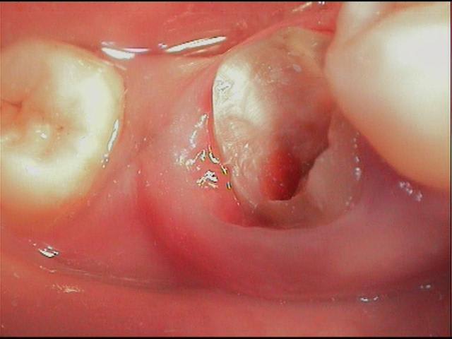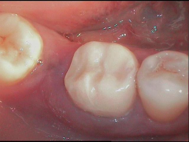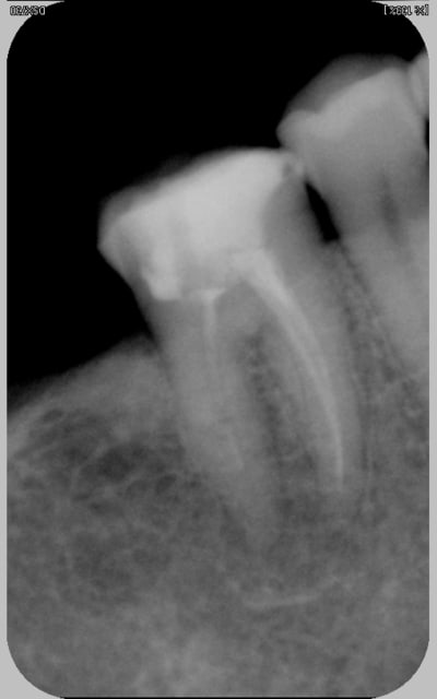 la tumefaction est bien en regard du canal distal qui ne parait pas tip top, pourtant je doute encore car je sais que son prat endodontise bien d'habitude. La dent est restaurée avec un compo collé (mais j'ai pas de photo là, dommage, il était chouette)