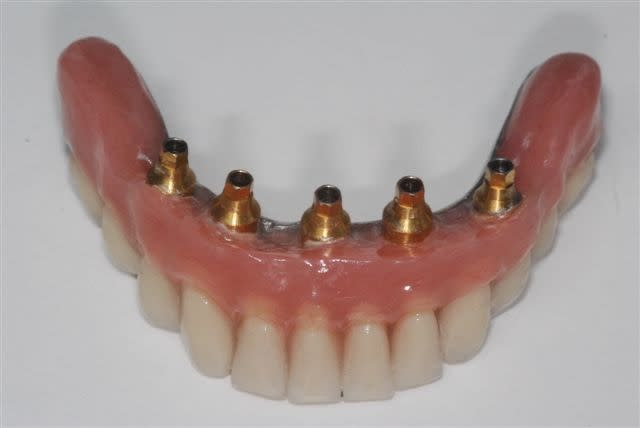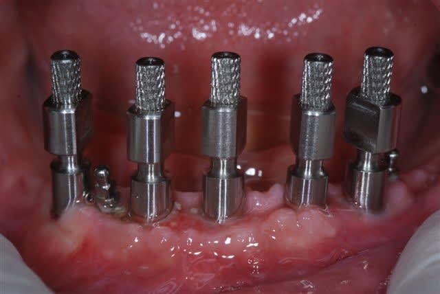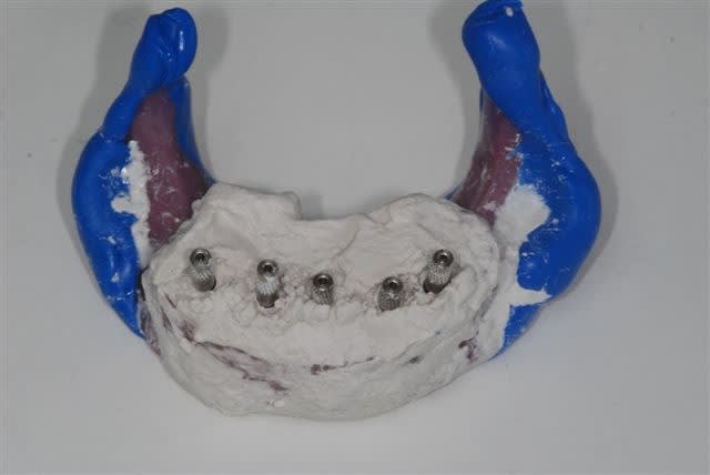 Alors voilà: empreinte pick-up mixte (silicone et plâtre snowhite), RIM avec cire calée sur des piliers hauts, et aujourd'hui retrait des implants provisoire et vissage de la prothèse.