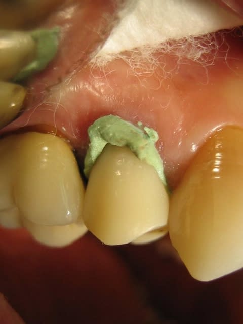 Cela pour gagner du temps. Je n'utilise pas l'Expasyl, sauf si ça saigne. Dans ce cas, je mets un comprecap anatomic (Roeko) sur l'expasyl et je fais serrer les dents dessus pendant 2 minutes.