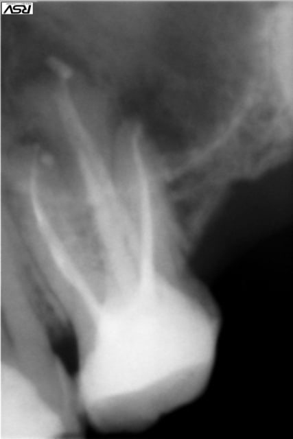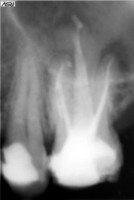 semaine suivante, tout bien comme y faut pour rassurer, pas de suites, même pas de douleurs post op, suis tout content. le délabrement et les parois résiduelles m'incitent a ancrer en palatin, tout va bene, jusqu'au moment ultime lors du scellement de l'ancrage: légère et fugace "sensation patient" à l'insertion du pivot dans le ciment de scellement.......grrrr....je me questionne mais le temps que je me réponde une certaine forme de fatalisme me fait poursuivre et terminer.