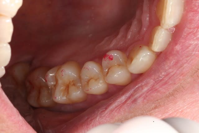 denture complète hormis 45 et 46, extraites pour des raisons mystérieuses de douleur irradiante.