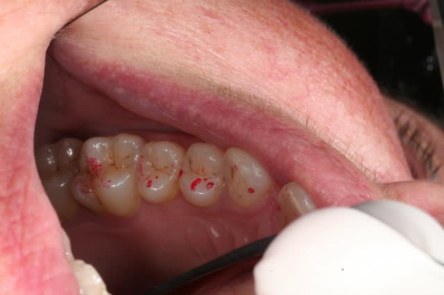 en Vasalva elle doit avoir dur de déboucher l'oreille droite lors de la déglutition subséquente, et maintenant la question fatidique, as-tu les fitres colorés ? si c'est négatif alors je peux t'envoyer une paire de lunettes avec filtres et un mode d'emploi, je peux aussi te guider par téléphone quand tu reverras ta patiente... mais d'après ce que tu me dis je penche pour une surcharge sur 14, voire 13 ou 15, je suppose que tu as réglé l'occlusion avec un contact léger sur 45 et 46, d'où la surcharge possible sur 15, 14 et 13, avec une préférence sur 14