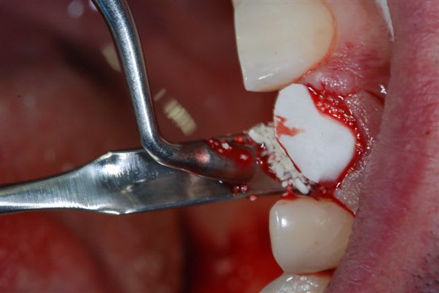 j'ai eu un cas ce matin tout indiqué pour cette technique, racine de 21 fracturée il y a 3 ans lors d'une intubation. j'ai découpé une biomend extend 15x20 en cône (maintenant zimmer commercialise des membranes déjà découpées).