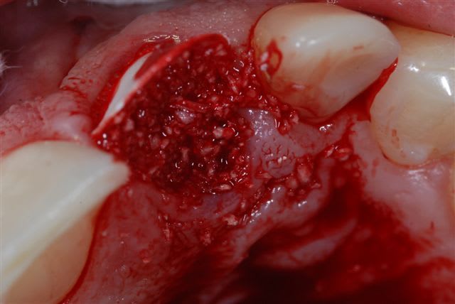 Un curetage méticuleux de l'alvéole est aussi un prérequis. L'utilisation "controlée" d'une fraise boule permet d'enlever tout reste de tissus de granulation ou de restes demodontaux.