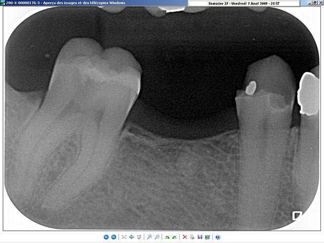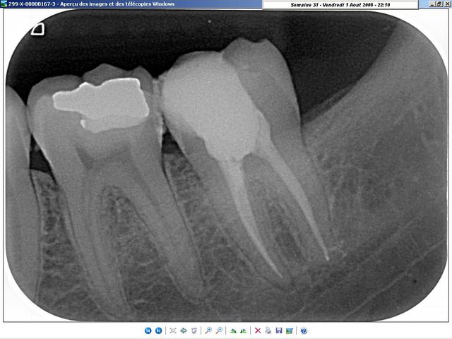 Les limes étaient des 21 mm, montées sur un CA réducteur avec une petite tête, ce qui me permet un meilleur centrage de l'instrument lors de l'introduction dans le canal.