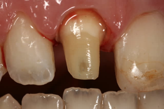 Il est pour moi évident que si les contraintes postéro-antérieures exercées sur un collage ont un pronostic moins favorables que sur un IC, à moins de s'appliquer à régler l'occlusion et le guide antérieur sans surcharge (ce qui est la moindre des choses), il reste préférable de se retrouver bien plus tard avec un cas de décollement plutôt qu'une fracture radiculaire par tenon acier, voire titane...