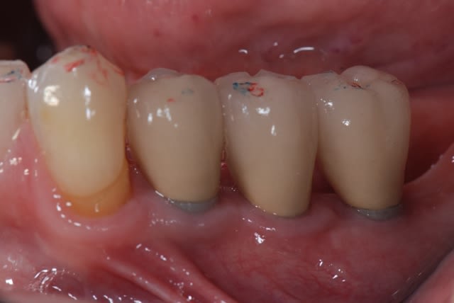 et puis, j'ai aussi un bridge sur implant zircone pur (Sandhaus) posé en 1992 qui est toujours en place et qui, avec le temps, a pourtant un important porte-à-faux(PJ N°2)